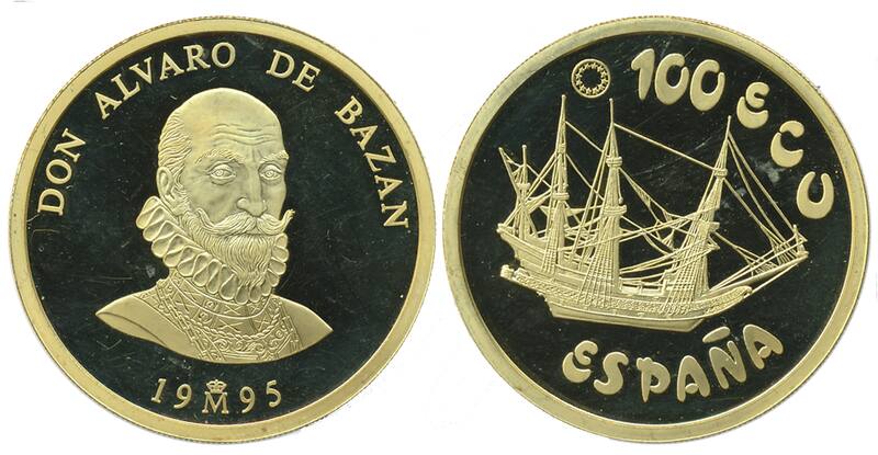 Esta moneda, parte de la serie homenaje a la Armada Española, tiene un peso de 34.55 gramos de oro de 900 milésimas. Está dedicada a Álvaro de Bazán, Marqués de Santa Cruz, que combatió en la batalla de Lepanto, entre otras.