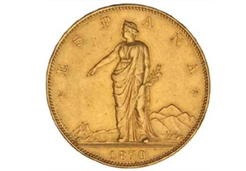 Tiene un valor de 150.000 euros. Fue acuñada únicamente en 12 unidades, y es muy cotizada por ello. Muestra en su reverso un escudo oficial monárquico de la época previo a la proclamación de la I República y una efigie que simboliza la soberanía nacional en su anverso.