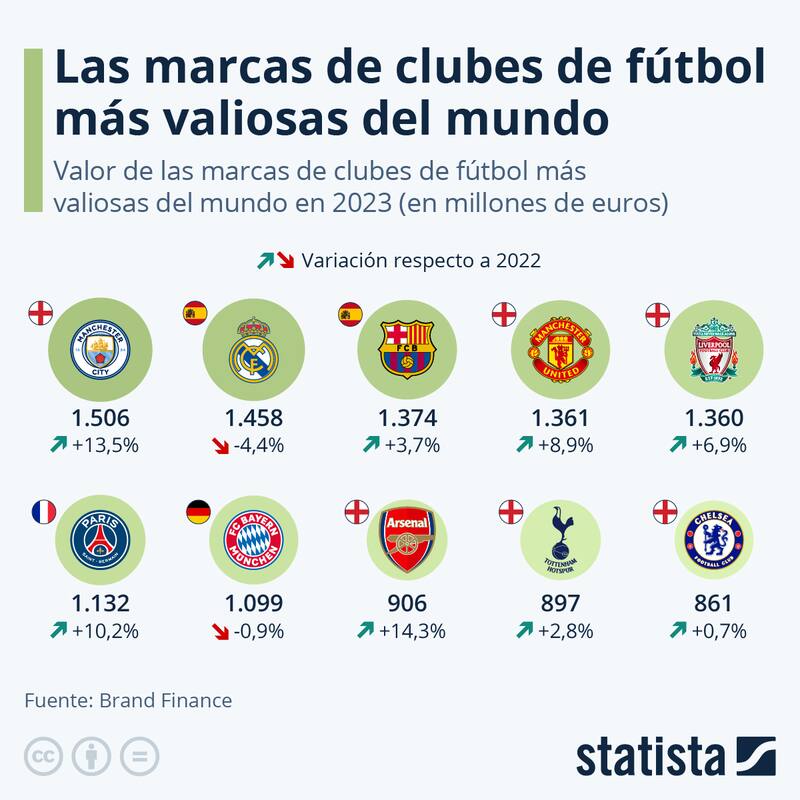 El sitio web Stadista, especializado en análisis de datos y tendencias, publicó un análisis de las marcas de fútbol más valiosas. Para ello se valieron del estudio Fútbol 50 2023, publicado por la firma analítica Brand Finance.