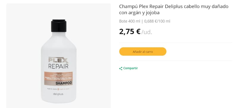 La referencia es para el champú Plex Repair de Deliplus para cabello muy dañado, un producto de excelencia que, dadas sus propiedades y los buenos resultados que se pueden obtener a partir de su uso, se vende a un precio considerablemente bajo: tan solo 2,75 euros el bote de 400 ml.