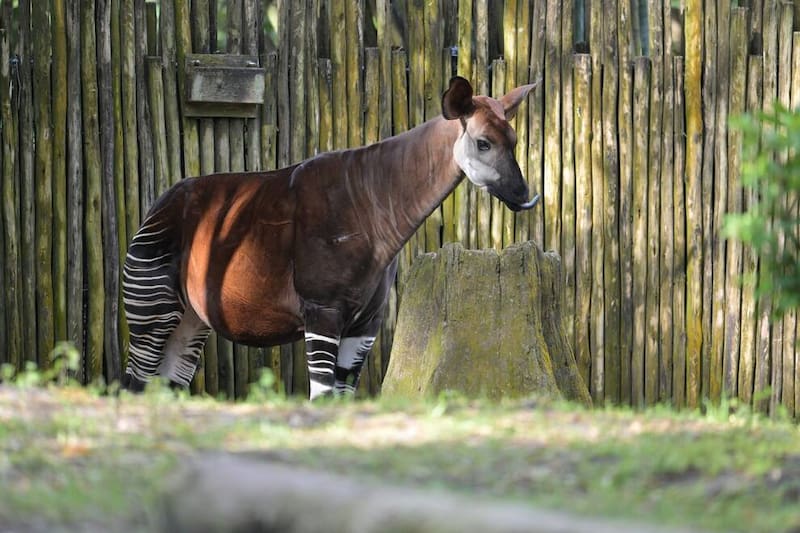 A pesar de su parentesco con la jirafa, lo que más llama la atención son sus patas y su parte trasera, que presentan rayas blancas y negras similares a las de una cebra.