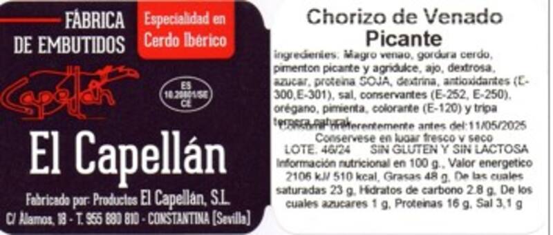 Los productos cárnicos de la marca El Capellán afectados por esta alerta incluyen diversas variedades de chorizos y morcillas envasadas en tripa de herradura. Los productos implicados son los siguientes: