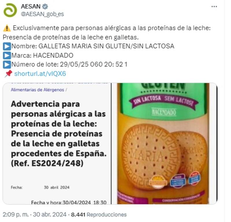 Concretamente, se ha identificado la presencia de proteína de leche en las famosas galletas María de la marca Hacendado, sin que esta información estuviera indicada en el etiquetado. Como medida precautoria, se recomienda a las personas alérgicas a la leche que eviten su consumo.