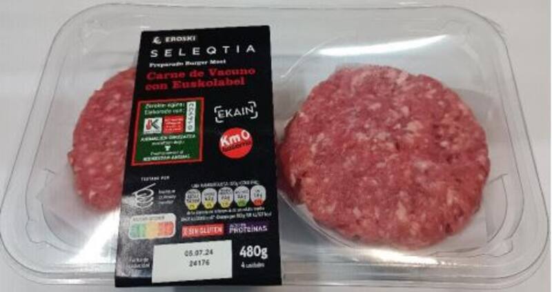 En concreto, el producto afectado es el Preparado Burger Meat carne de vacuno Eusko Label con fecha de caducidad el 1° de julio de 2024. La inmovilización y retirada del mercado afecta al lote 24172, pack cuatro unidades de 480 gramos, de la marca Eroski Seleqtia.