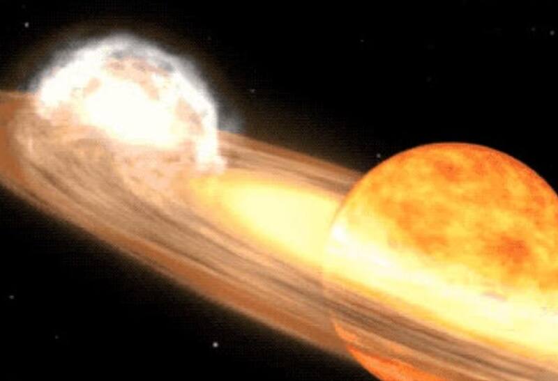 Los dos cuerpos celestes se vinculan y forman una estrella conocida como nova. Cuando la más grande se queda sin combustible nuclear, comienza a expulsar parte de su contenido hacia la más pequeña, según cuenta la NASA.