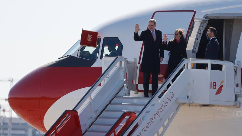 Don Felipe y doña Letizia volaron al mediodía desde Madrid y aterrizaron en Luanda a última hora de la tarde acompañados por el ministro de Asuntos Exteriores, José Manuel Albares, y la secretaria de Estado de Comercio, Xiana Méndez.