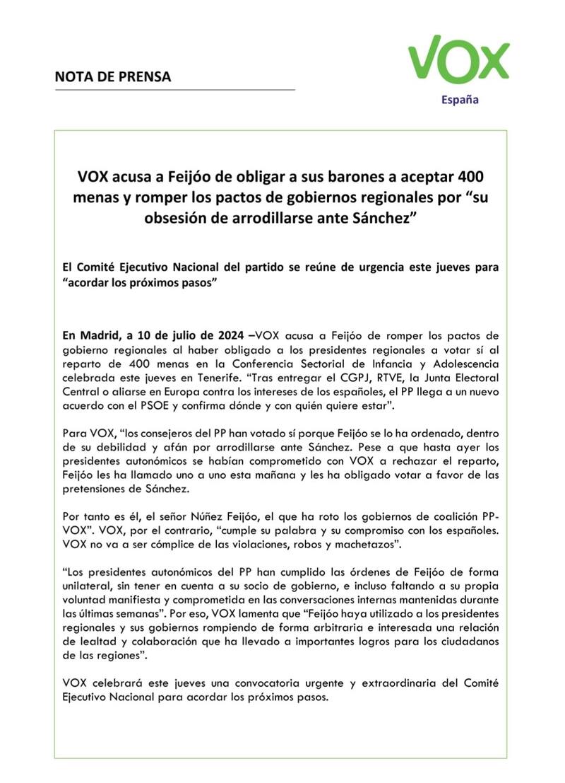 De hecho, continua la nota del partido, los presidentes autonómicos se habían comprometido con Vox a rechazar el reparto, pero Feijóo -según Vox- les ha llamado "uno a uno" esta mañana y les ha obligado a votar a favor.