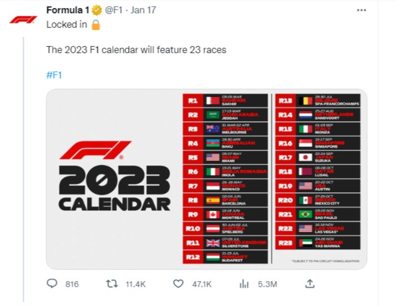 Tras el comienzo del 2023, ya se ha confirmado el nuevo calendario de carreras para este año. Sin embargo, se han presentado cambios debido a que el Gran Premio de China no estará presente por cuarto año consecutivo, luego de la pandemia de coronavirus.