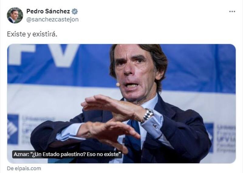 El presidente del Gobierno Pedro Sánchez ha respondido de forma contundente a José María Aznar, luego de que el exmandatario se expresara en contra de la creación de un estado palestino. "¿A qué Estado se están refiriendo? Eso no existe", dijo este jueves durante unas jornadas organizadas por la Fundación para el Análisis y los Estudios Sociales (FAES), que dirige.