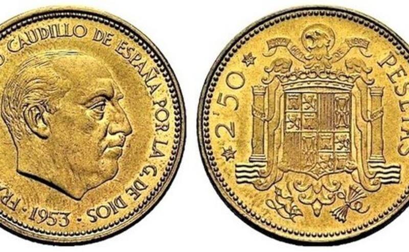 Estas extrañas piezas fueron lanzadas en el año 1953 y quitadas de circulación en 1971. En una de sus caras, tiene grabado el busto del dictador español Francisco Franco Bahamonde en el reverso y con la leyenda que expresa "caudillo de España por la gracia de Dios".
