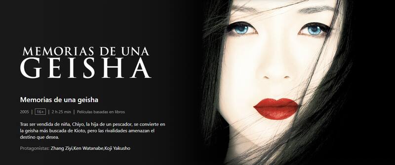 Memoirs of a Geisha (en su idioma original) es un drama adaptado de la novela de Arthur Golden que en 2005 ganó tres premios Óscar a mejor fotografía, vestuario y dirección artística.
