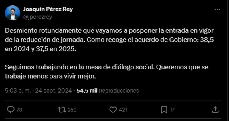 "Desmiento rotundamente que vayamos a posponer la entrada en vigor de la reducción de jornada. Como recoge el acuerdo de Gobierno: 38,5 en 2024 y 37,5 en 2025. Seguimos trabajando en la mesa de diálogo social. Queremos que se trabaje menos para vivir mejor", ha subrayado Pérez Rey en su perfil de 'X'.