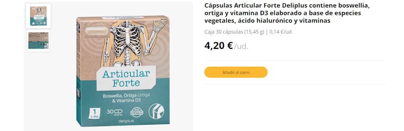 Las cápsulas Articular Forte de Deliplus están diseñadas para mejorar la flexibilidad corporal. Presentadas en una pequeña caja de cartón con 30 píldoras de 15,45 gramos, se ofrecen a un costo reducido de 4,20 euros.