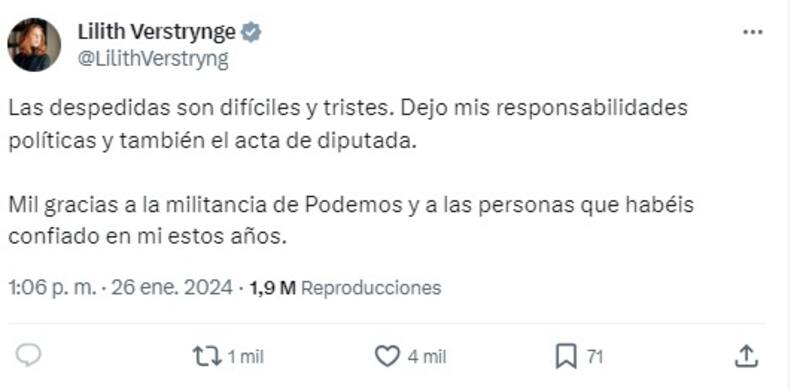 La diputada de Podemos y secretaria de Organización del partido, Lilith Verstrynge, comunicó este viernes su decisión de renunciar tanto a sus responsabilidades políticas como a su cargo como diputada.