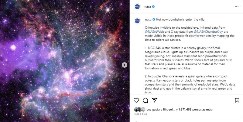 La agencia espacial mostró días atrás increíbles imágenes del espacio tomadas por el telescopio James Webb y el Observatorio de rayos X Chandra, que se encuentra en un satélite lanzado en 1999.