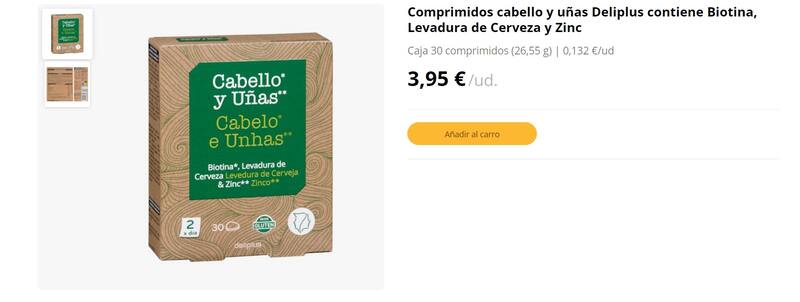 La referencia es para los Comprimidos Cabello y Uñas de la marca Deliplus, fabricados a base de biotina, levadura de cerveza y zinc. Su caja contiene 30 unidades de 26,55 gramos cada uno.