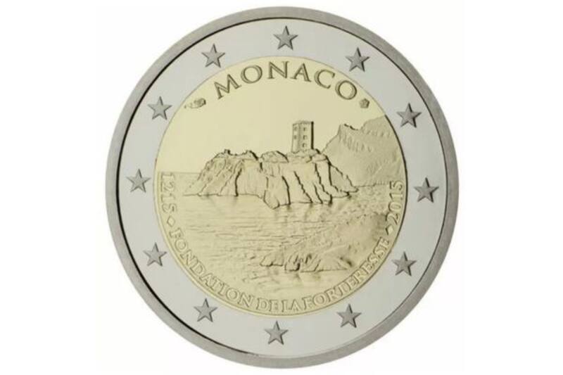En esta moneda del Principado de Mónaco de 2015 figura la Fortaleza. Además, en la parte superior, se puede leer el nombre del país emisor, Mónaco, la marca de la Ceca de París y del maestro grabador.