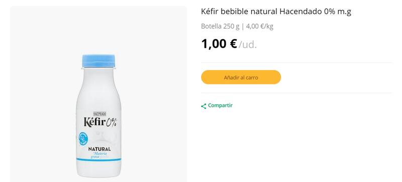 Se trata del Kéfir de la marca Hacendado, también llamado yogur búlgaro, el cual se vende a tan solo 1 euro tanto en las góndolas de Mercadona como también en la tienda online de la compañía.
