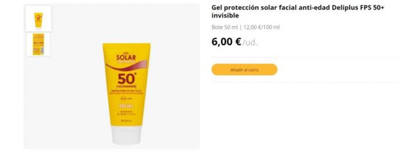 La referencia en cuestión es el Gel con protección solar facial antiedad de la marca Deliplus, que incorpora entre sus componentes un factor de protección solar 50+, ideal para los días más cálidos y con una mayor exposición a los rayos UV.