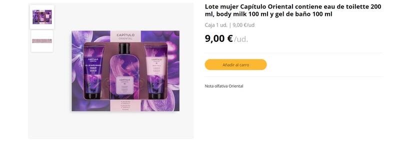 La referencia es para el lote de mujer llamado Capítulo Oriental, el cual incluye no solamente el perfume antes mencionado sino también body milk y gel de baño, tres productos de muy buena calidad con un aroma que remite al famoso La Vie Est Belle de Lancome.
