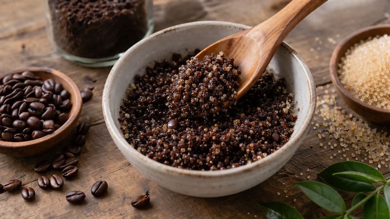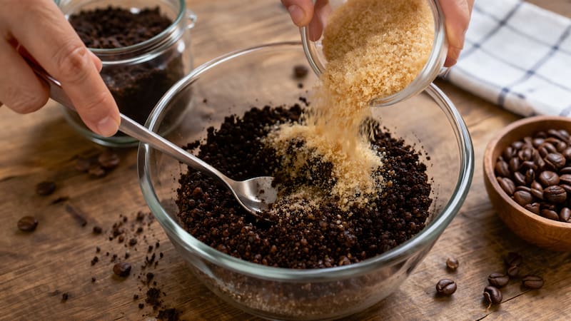 El café molido ya utilizado conserva propiedades exfoliantes naturales gracias a su textura granulada. Al combinarlo con azúcar, se potencia su efecto, creando una mezcla ideal para remover células muertas de la piel, mejorar la circulación y dejar una sensación de suavidad inmediata.