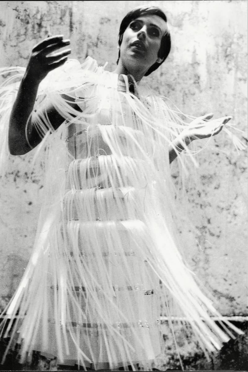 En 1967, Paco Rabanne volvió a sorprender a su público con una serie de vestidos protagonizada por un material tan efímero como inesperado: el papel. La colección tenía como pieza destacada un vestido plisado blanco, el cual se sujetaba en el cuerpo de la modelo a través de dos lazos que funcionaban a modo de tirantes.