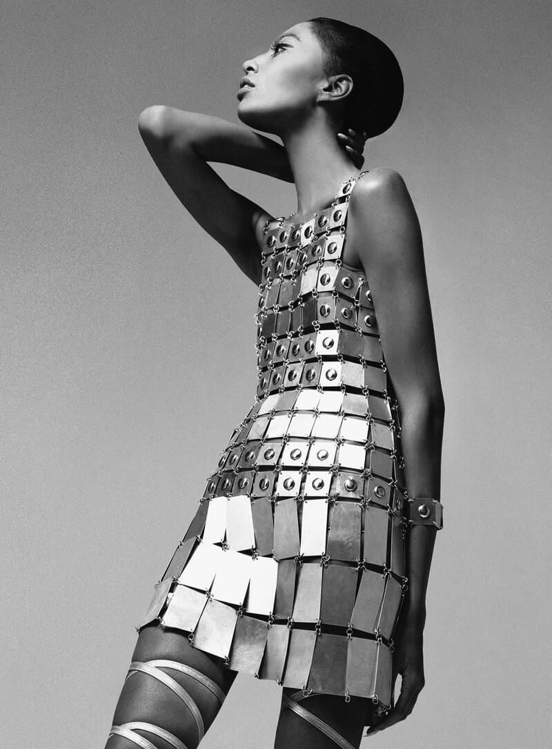 Donyale Luna, la mítica supermodelo afroamericana, apareció en la edición de abril de 1966 de la Vogue norteamericana con uno de los primeros diseños de Paco Rabanne. Las fotos de Guy Bourdin mostraban a la modelo con un vestido diminuto, hecho a partir de un plástico ligero conocido como rhodoïd. La forma se la daba una serie de anillas metálicas, las cuales unían los discos, rompiendo la ilusión de ser un tejido continuo.