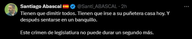 "El gobierno que decretó dos estados de alarma ilegales sigue de brazos cruzados 48 horas después de la tragedia. Gente conviviendo con cadáveres, criminales sembrando el terror y españoles abandonados", ha censurado Abascal.