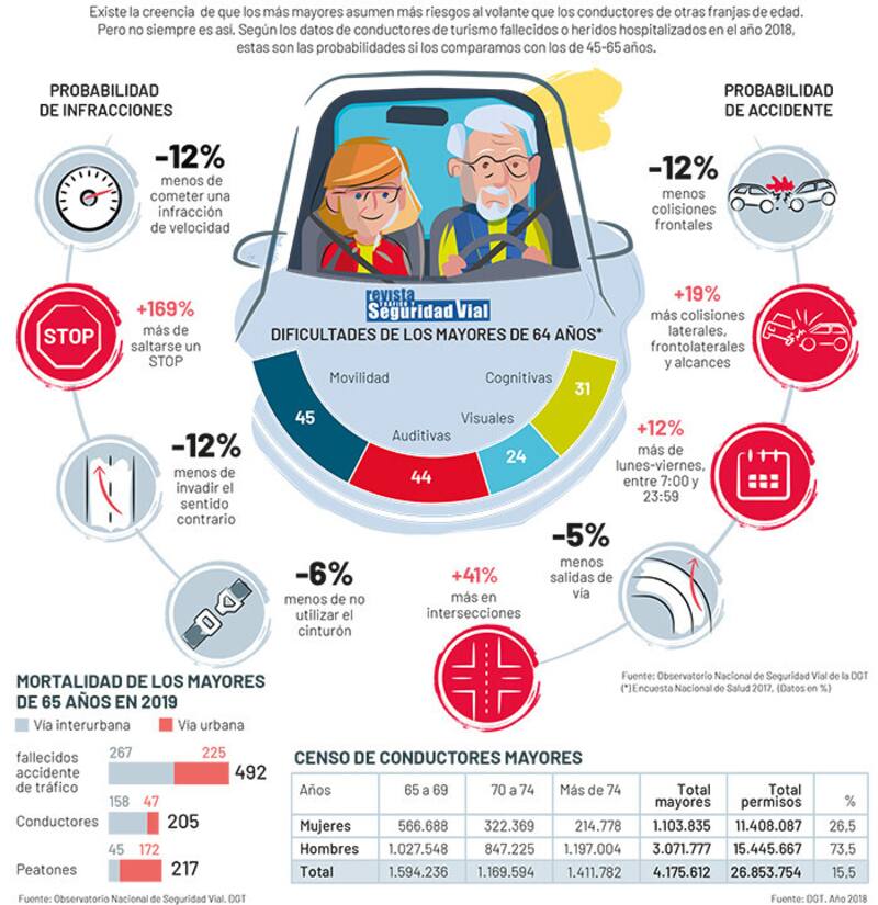 Según el censo de la DGT muestra que de los 65 a los 69 años, 985.927 personas disponen del registro con renovación cada cinco años; 670.000 es la población de entre los 70 a los 74 con carnet; y por encima de los 74 años, siguen teniendo el carnet 493.873 personas.