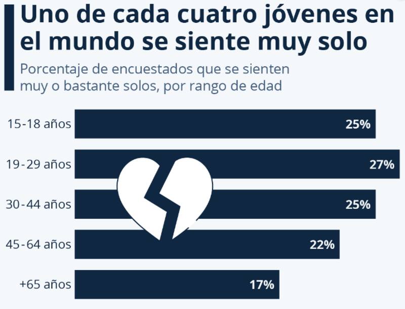 Los resultados del informe demostraron que el 25% de los encuestados a nivel mundial de entre 15 y 18 años se sienten "bastante solos" o "muy solos", una cifra que aumenta al 27% en los entrevistados de entre 19 a 29 años.