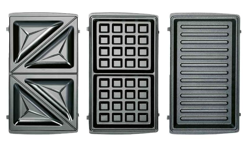 Este versátil aparato incluye tres juegos de placas: una destinada a la preparación de sándwiches, otra para la elaboración de gofres y una adicional para asar a la parrilla.