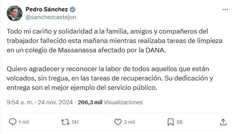 "Quiero agradecer y reconocer la labor de todos aquellos que están volcados, sin tregua, en las tareas de recuperación. Su dedicación y entrega son el mejor ejemplo del servicio público", ha añadido Sánchez en un mensaje publicado en la red social X.