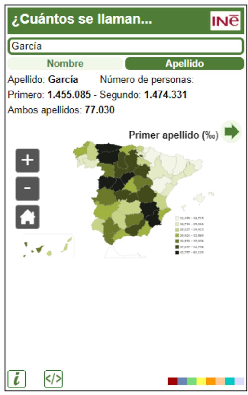 En cuanto a los apellidos, también se proporciona información sobre su frecuencia tanto como primero o segundo, e incluso se indica cuántas personas los poseen en ambos casos. Al igual que con los nombres, se puede ver la distribución geográfica por provincias.