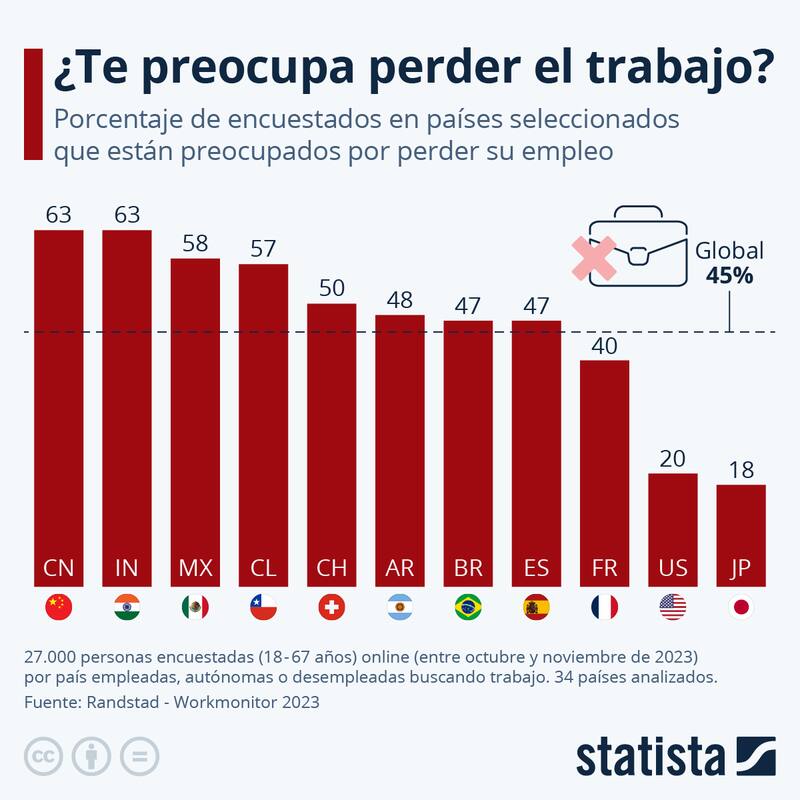 Frente a esta problemática, un informe de la consultora Randstad, desglosada por Statista, reveló que la preocupación promedio por la pérdida del trabajo se sitúa en el 45%, lo que sugiere que, en general, "existe una moderada inquietud en todo el mundo respecto a la seguridad laboral".