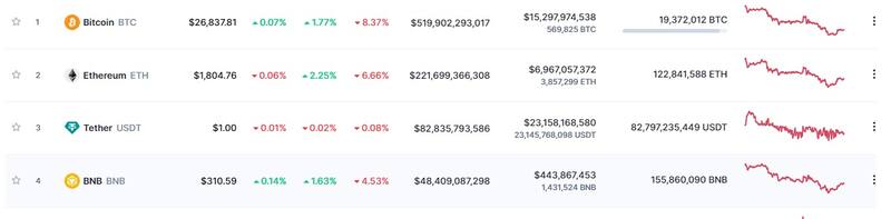 Las principales criptomonedas han experimentado caídas esta semana, oscilando alrededor del 6 y 7%. En particular, Bitcoin ha caído un 10% en los últimos siete días y un 4% en las últimas 24 horas, cotizando en torno a los USD 26.400. Ether ha retrocedido un 7,3% durante la semana y un 3,2% diariamente, cotizando en alrededor de los USD 1770. Otras criptomonedas como XRP, Cardano, Dogecoin y Solana han perdido entre un 6,5% y un 8% en los últimos siete días.