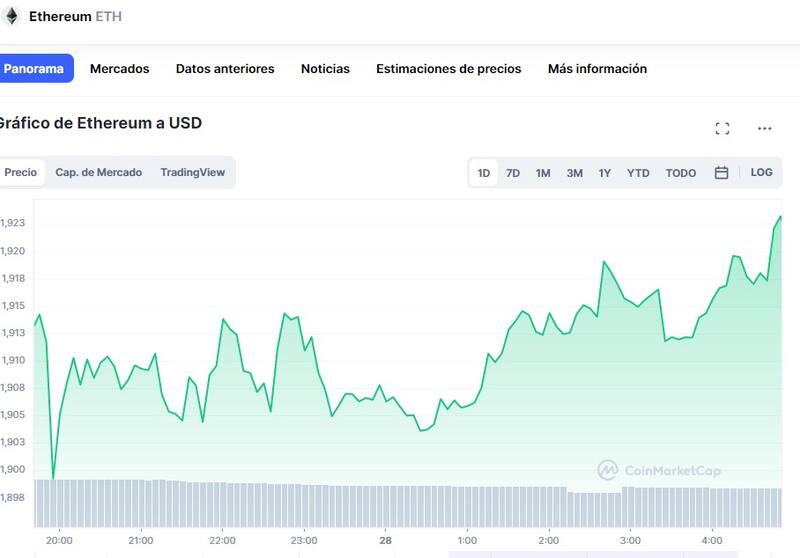 Al día de hoy, ETH cotiza en verde, concretamente, a USD 1908,45, lo que significa una suba del 1,15% respecto a su precio anterior.
