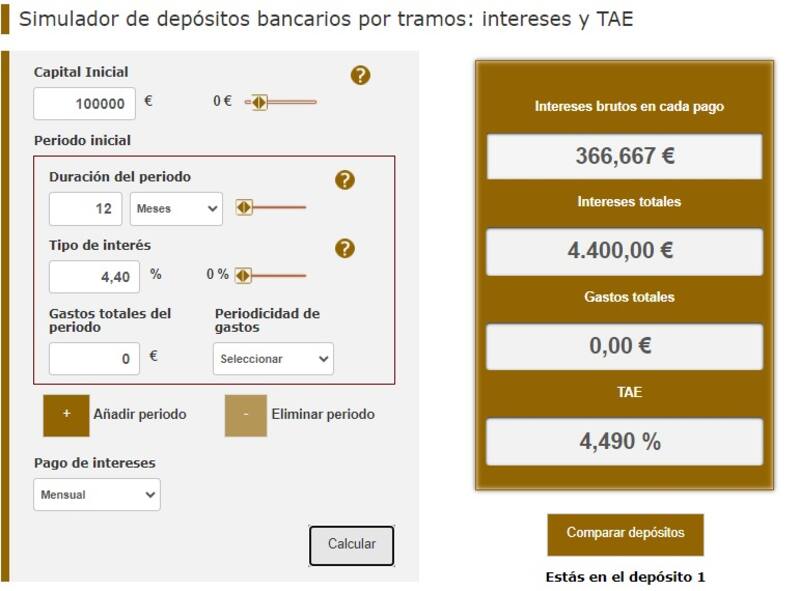 Al realizar la simulación en la web oficial del Banco de España se puede comprobar que, en caso de realizar un eventual depósito de 100.000 euros, por cada uno de los 12 meses se cobrarían unos 366,67 euros.