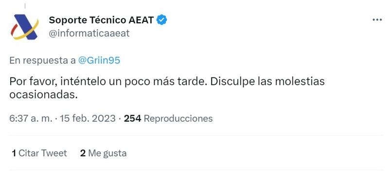 "Situación actual en la página web de la Agencia Tributaria para solicitar los 200 euros. Han pasado 28 minutos desde que abrieron las solicitudes, totalmente caída de la cantidad de visitas que está recibiendo", manifestaba un usuario de Twitter.