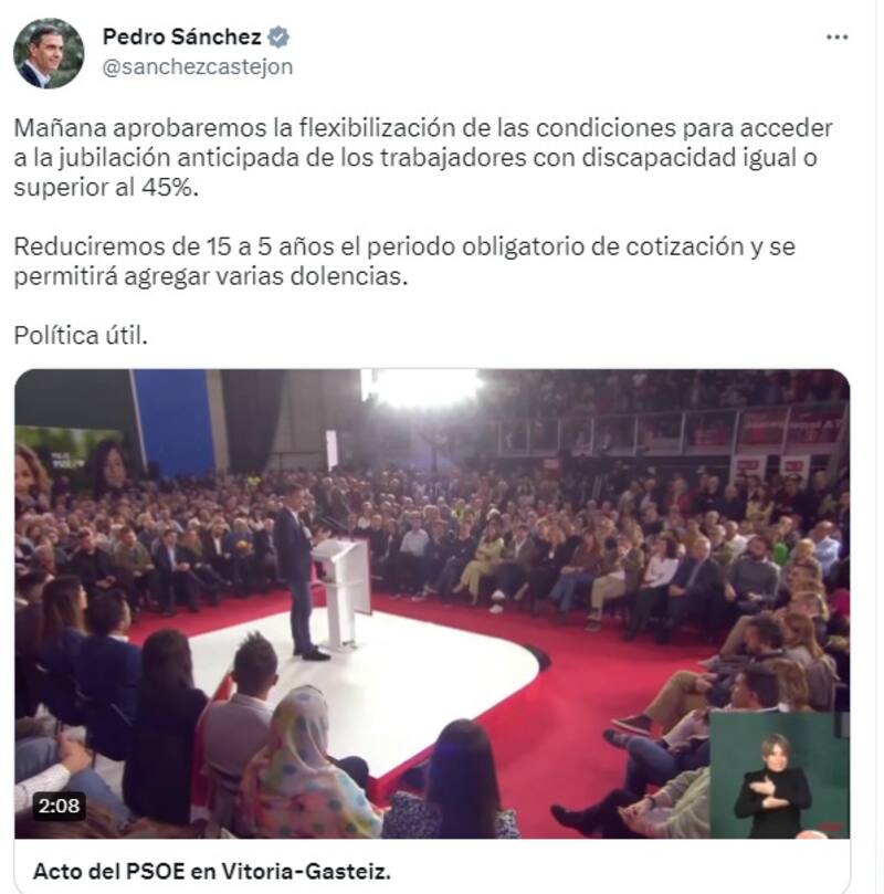 Asimismo, el presidente también ha anunciado cambios con respecto a la jubilación anticipada. El periodo obligatorio de cotización pasará a ser de 15 a 5 años para aquellos trabajadores con discapacidad igual o superior al 45%.