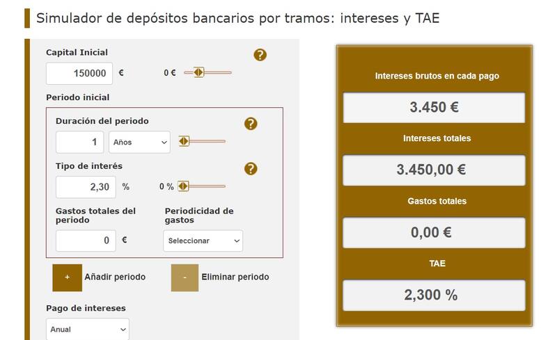 Dicho todo esto ya se puede calcular la rentabilidad máxima en el simulador del Banco de España, tal y como se ve en la imagen: con una inversión de 150.000 euros y al cabo de 12 meses, la remuneración total será de 3450 euros, tal y como se ve en la imagen anterior.