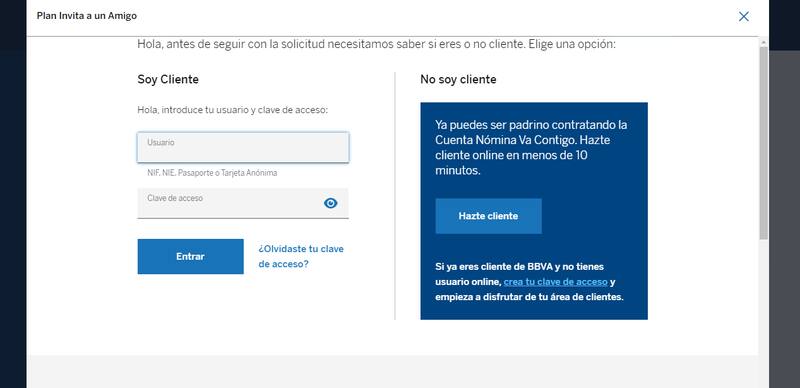 Para acceder a la promoción debes entrar en tu área personal del banco y seleccionar la oferta. Sólo debes pulsar en Plan Amigo Nómina y posteriormente en Activar Plan. BBVA te dará un código que debes enviar a tu amigo para que habilite su cuenta. Así, cada vez que alguien se registre en el banco gracias a ti, ganarás 50 euros.