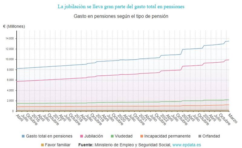 Las pensiones de jubilación suponen el mayor gasto, acumulando 9870,39 millones de euros por encima de las pensiones de viudedad (2191,2 millones de euros), incapacidad permanente (1217,23 millones), orfandad (177,69 millones) y las de favor familiar (35,98 millones).