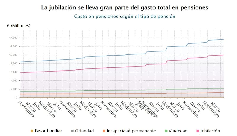 Las pensiones de jubilación suponen el mayor gasto, acumulando 9999,19 millones de euros por encima de las pensiones de viudedad (2199,5 millones de euros), incapacidad permanente (1262,83 millones), orfandad (177,73 millones) y las de favor familiar (36,56 millones).