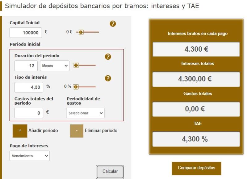Al utilizar la herramienta de simulación en el sitio web oficial del Banco de España, se puede verificar que si se realiza undepósito eventual de 100.000 euros por un período de 12 meses, al finalizar el plazo del depósito bancario se recibiría un total de 4300 euros. Cabe aclarar que esta opción no permite la cancelación anticipada del dinero.