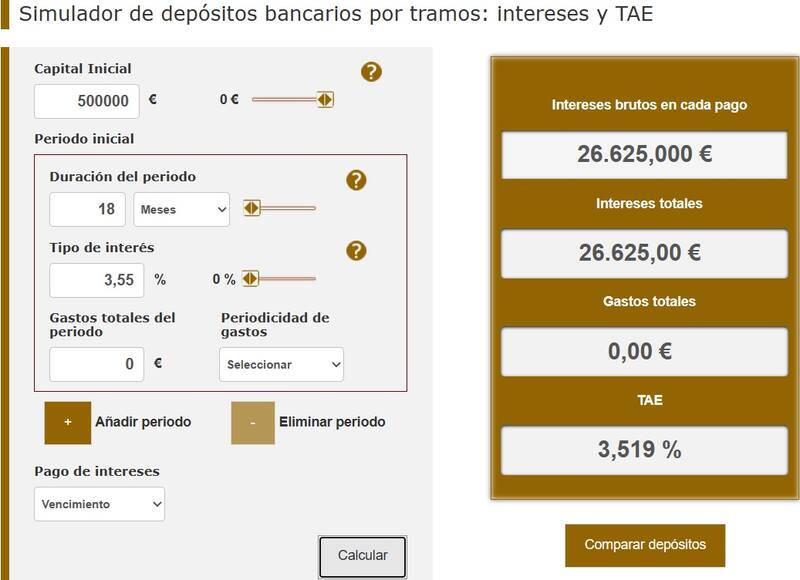 Se trata de un depósito a 18 meses, con un aporte mínimo de 5.000 euros y un máximo de 3.000.000 euros, y una tasa de interés de 3,55% TAE (3,50% TIN); por lo que, si apuestas a invertir 500.000 euros obtendrás un total de 26.625 euros al finalizar el plazo, unos 1.479, 17 euros por mes.