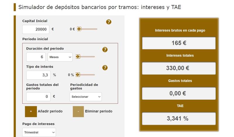 Por ejemplo, con una inversión inicial de 20.000 euros se puede lograr una ganancia total de 330 euros al cabo de esos 180 días, tal y como se observa en la imagen del simulador de depósitos del Banco de España.