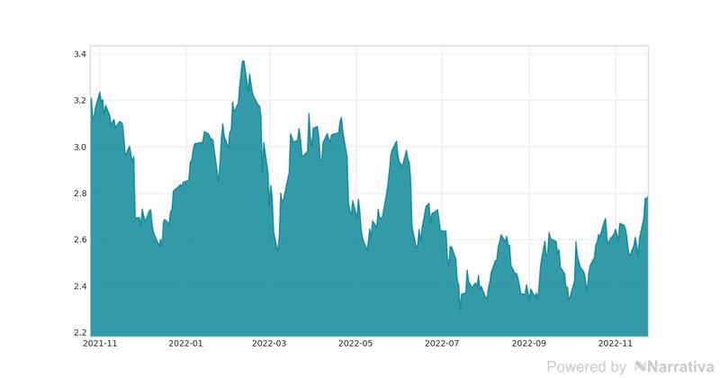 Jornada sin cambios para Banco Santander, que se paga a 2,79, lo cual implicó un cambio del 0,23% frente a los 2,79 de la sesión previa.