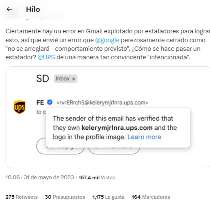 El experto en ciberseguridad, Chris Plummer, publicó en su cuenta de Twitter un hecho de este fallo en Gmail. Es un tweet fraudulento de la empresa de transporte de paquetes UPS.