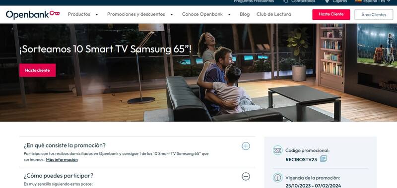 Openbank sorprende una vez más al anunciar un sorteo inigualable. Puedes participar con tus recibos domiciliados en Openbank y conseguir 1 de las 10 Smart TV Samsung 65" que la banca digital está ofreciendo.