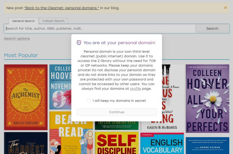 Después, los usuarios son redirigidos a un "dominio personal" que es único para cada usuario y está vinculado a su cuenta. Tanto los usuarios antiguos como los nuevos reciben dos dominios únicos cada uno, junto con una advertencia de Z-Library instando a mantenerlos en privado.